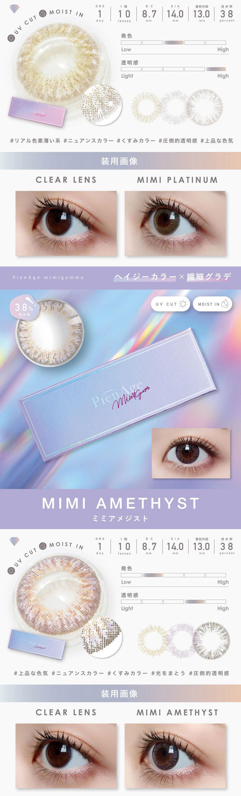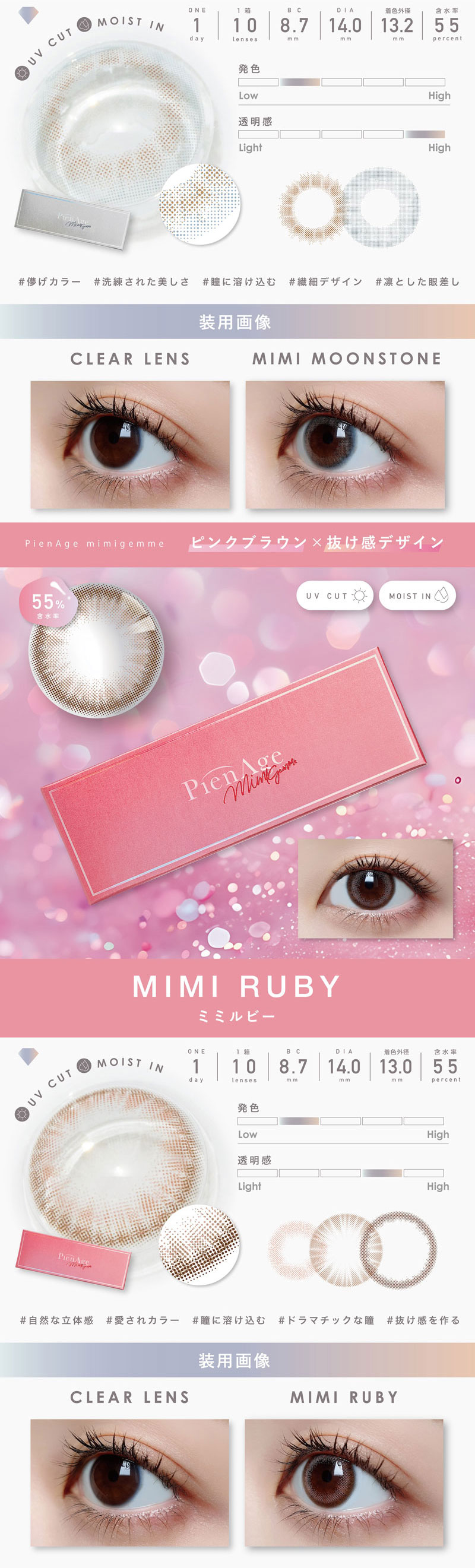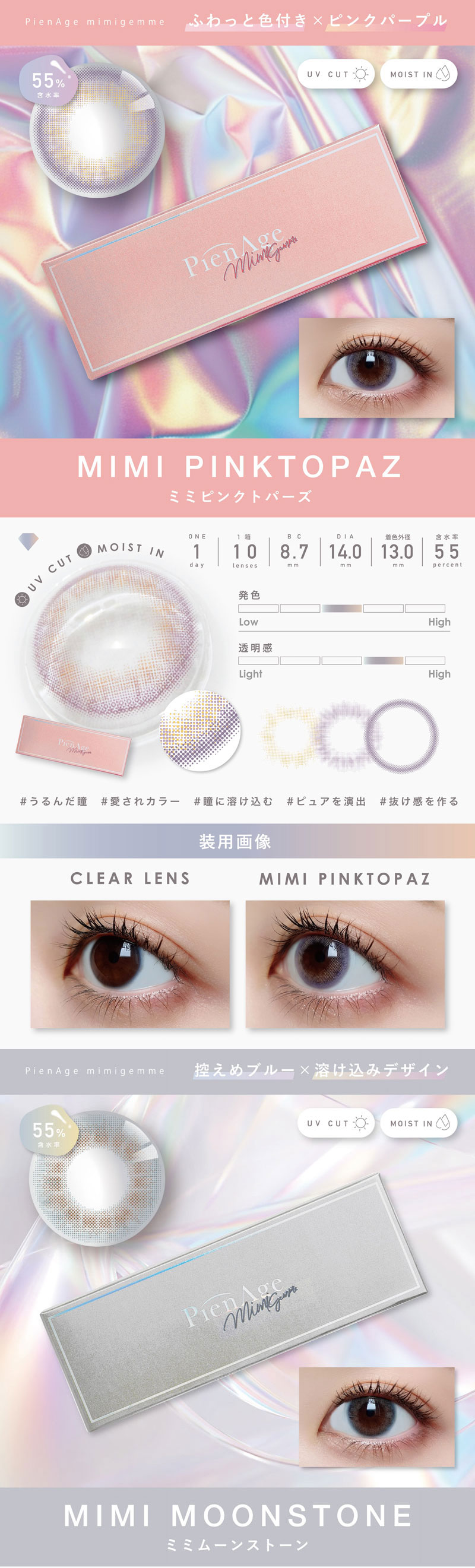 | カラー | ミミムーンストーン、ミミピンクトパーズ、ミミルビー、ミミペリドット、ミミプラチナ、ミミアメジスト、ミミアンバー、ミミエメラルド、ミミアクアマリン | ||||