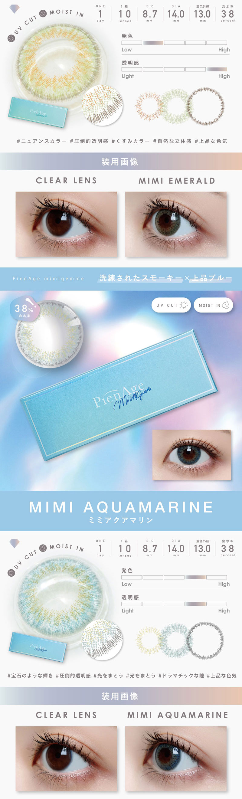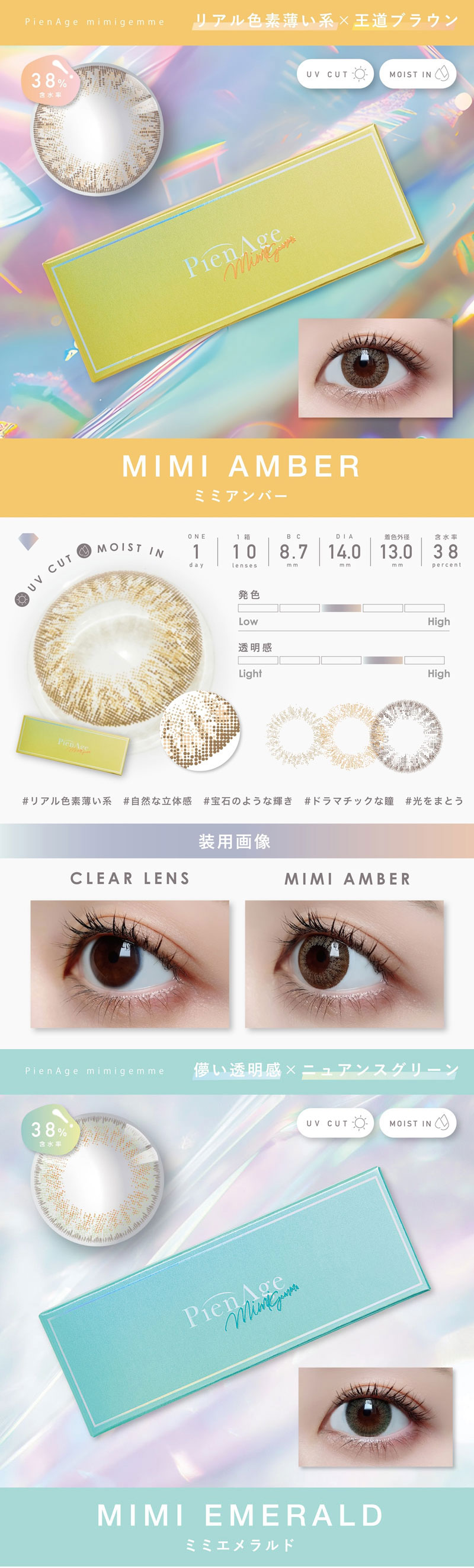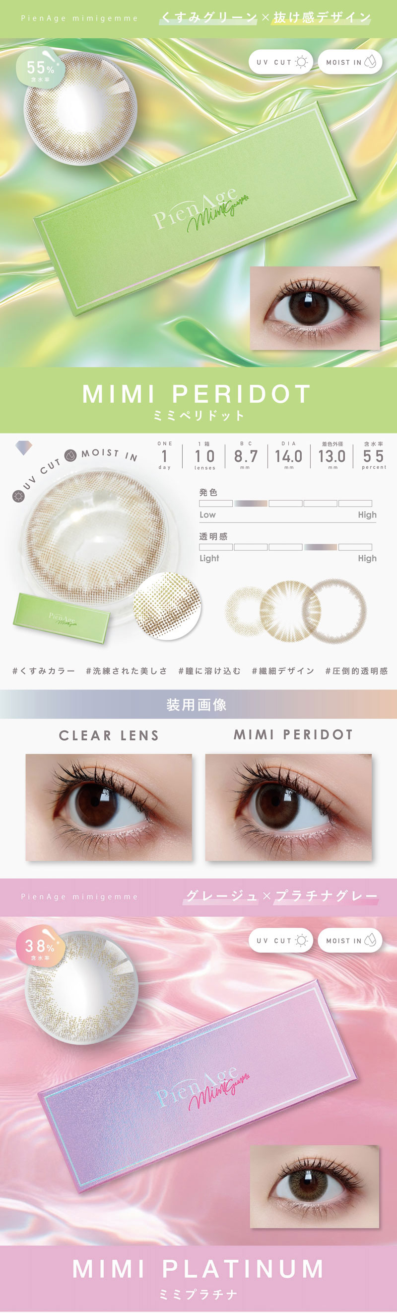 | カラー | ミミムーンストーン、ミミピンクトパーズ、ミミルビー、ミミペリドット、ミミプラチナ、ミミアメジスト、ミミアンバー、ミミエメラルド、ミミアクアマリン | ||||